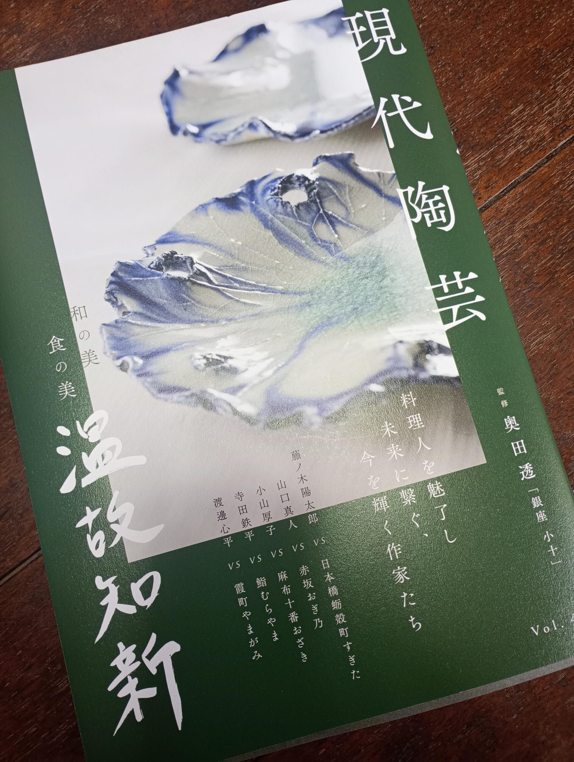 藤吉憲典、久しぶりのメディア登場です。和食の名店・銀座小十の店主・奥田 透さんからお電話をいただいたのは、ちょうど一年前ぐらいのことだったと思います。それまでにお会いしたことはありませんでしたが、事前に銀座黒田陶苑さんからご連絡をいただき、藤吉憲典の器をたびたびお買い上げになり、お店でお使いくださっていたことを知りました。『温故知新』は、奥田さんが監修している、日本料理を取り巻くさまざまなトピックスを取り上げる季刊誌。陶芸作家の特集号で、総勢16名のなかの一人として取材してくださいました。